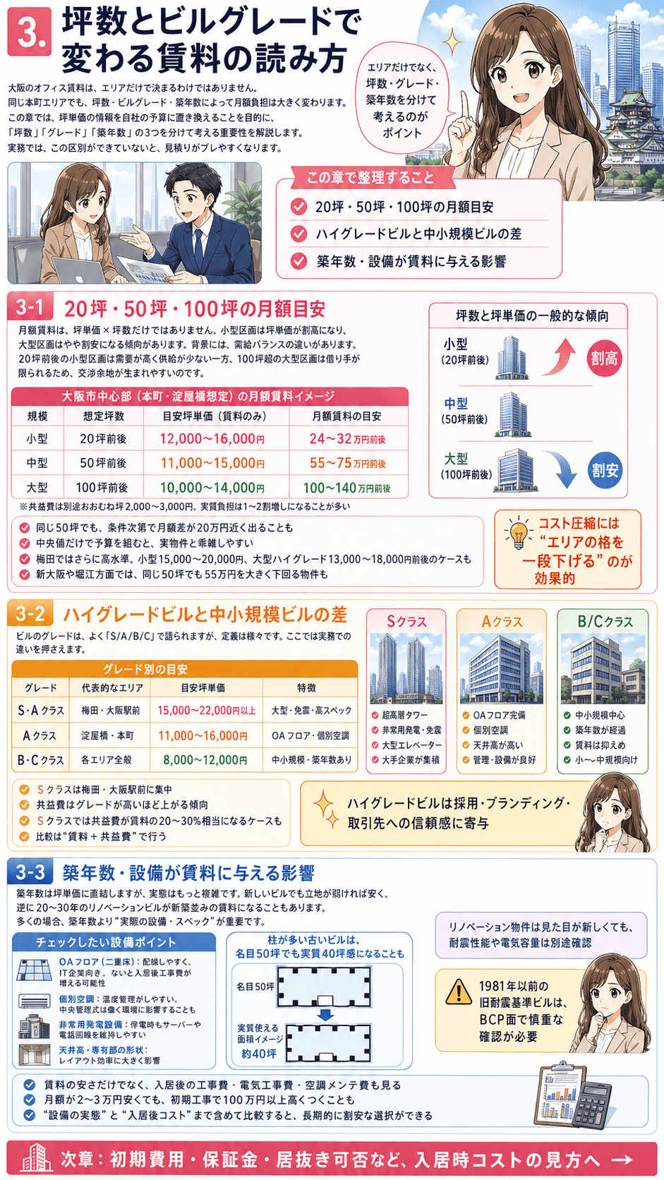 大阪オフィスの賃料相場は、エリアだけで決まるわけではありません。同じ本町エリアでも、坪数の規模やビルのグレードによって、月額の負担感はまったく異なります。「エリア別の坪単価は分かった、でも自社の予算に当てはめるとどうなるのか」という疑問を解消するのが、この章の目的です。