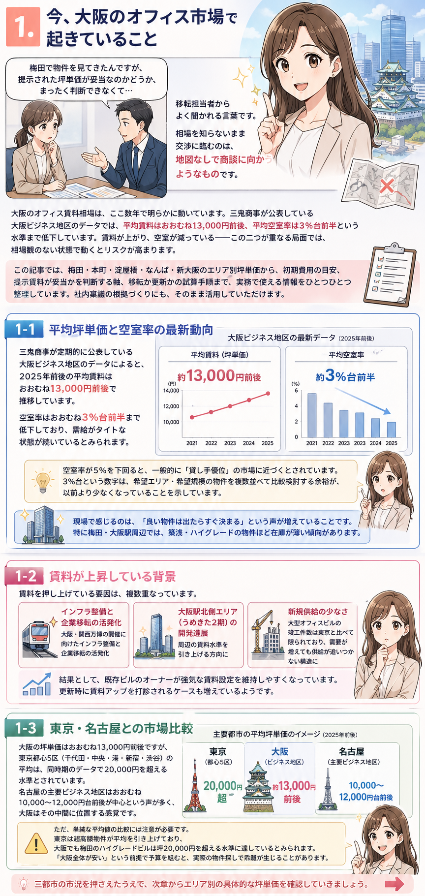 大阪のオフィス賃料相場は、ここ数年で明らかに動いています。三鬼商事が公表している大阪ビジネス地区のデータでは、平均賃料はおおむね13,000円前後、平均空室率は3%台前半という水準まで低下しています。賃料が上がり、空室が減っている——この二つが重なる局面では、相場観のない状態で動くとリスクが高まります。