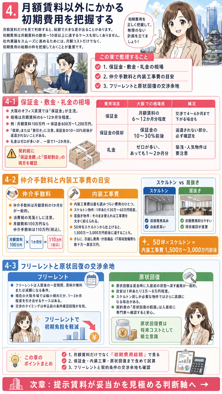 この記事では、梅田・本町・淀屋橋・なんば・新大阪のエリア別坪単価から、初期費用の目安、提示賃料が妥当かを判断する軸、移転か更新かの試算手順まで、実務で使える情報をひとつひとつ整理しています。社内稟議の根拠づくりにも、そのまま活用していただけます。