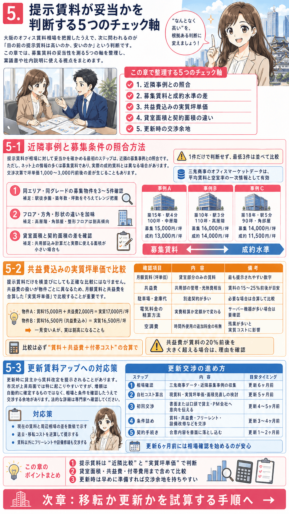 提示賃料の妥当性を判断する力は、一度身につければ移転検討でも更新交渉でも繰り返し使えます。「高いかどうかわからないまま契約する」という状況を避けるために、今回整理した5つの軸を手元に置いておいてください。