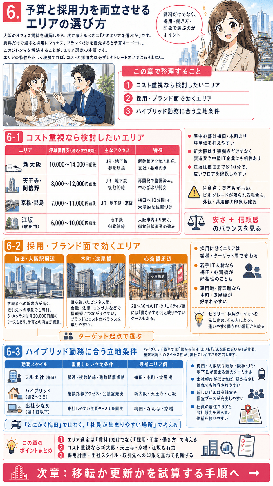 コスト削減を優先するなら新大阪、業種・ブランドにこだわるなら心斎橋周辺、という使い分けが実務でよく見られます。どちらのエリアも、梅田・本町の「相場感」を基準に置いたうえで、自社の事情に照らして比較するのが現実的な進め方です。