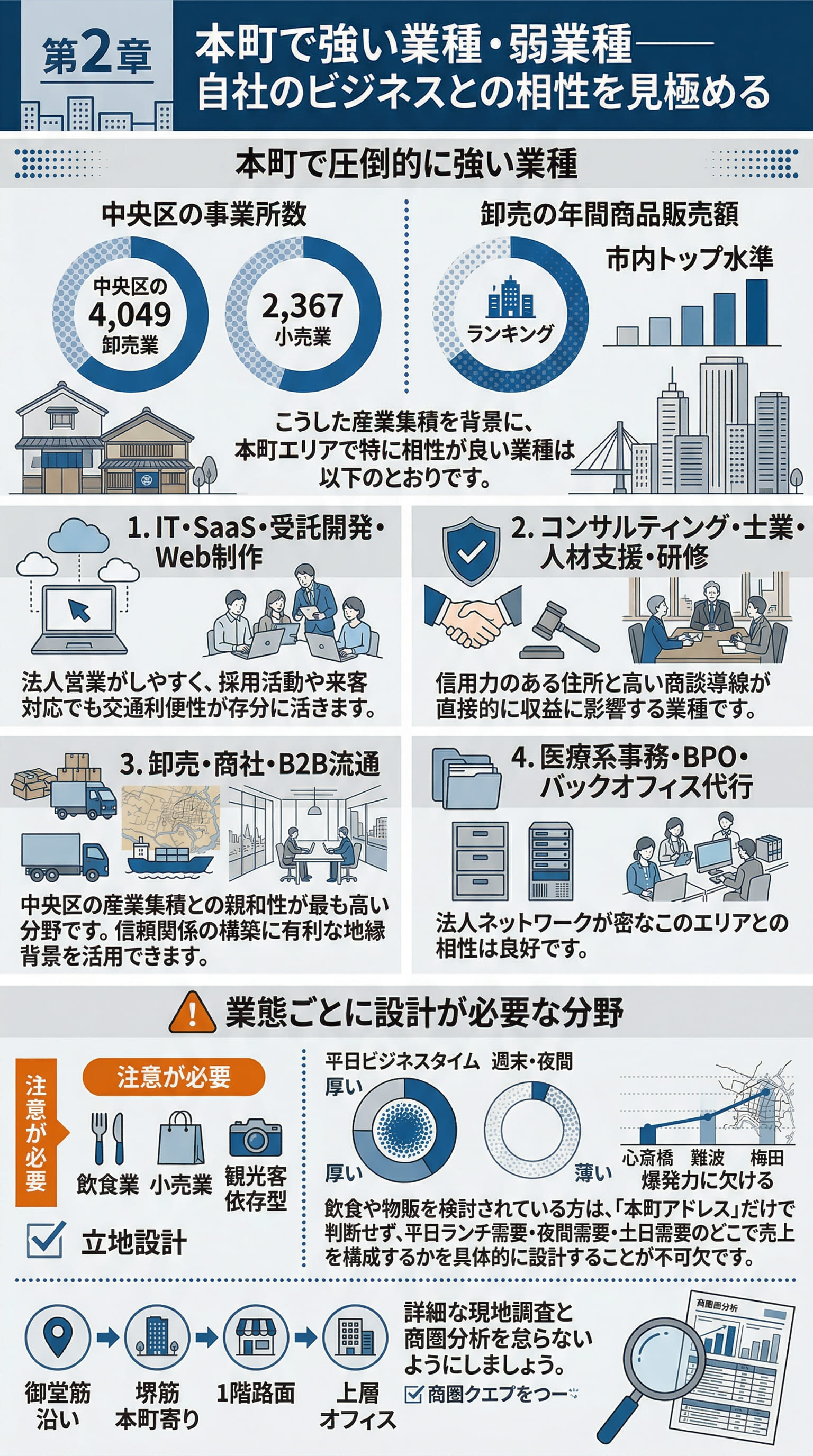 こうした産業集積を背景に、本町エリアで特に相性が良い業種は以下のとおりです。