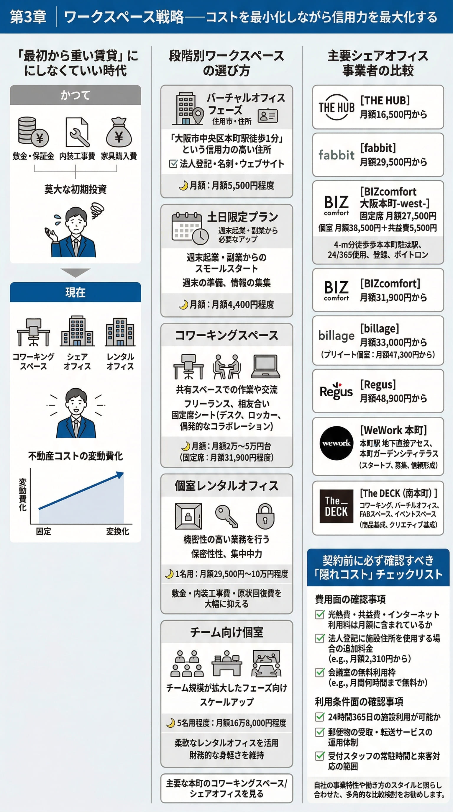 創業初期はバーチャルオフィスやコワーキングスペースで身軽に始め、売上が安定してきた段階で個室レンタルオフィスへ移行し、さらに事業拡大に伴い本格的な賃貸オフィスへと移転する——この「段階的拡張アプローチ」が、本町エリアで最もリスクが小さい拠点戦略です。