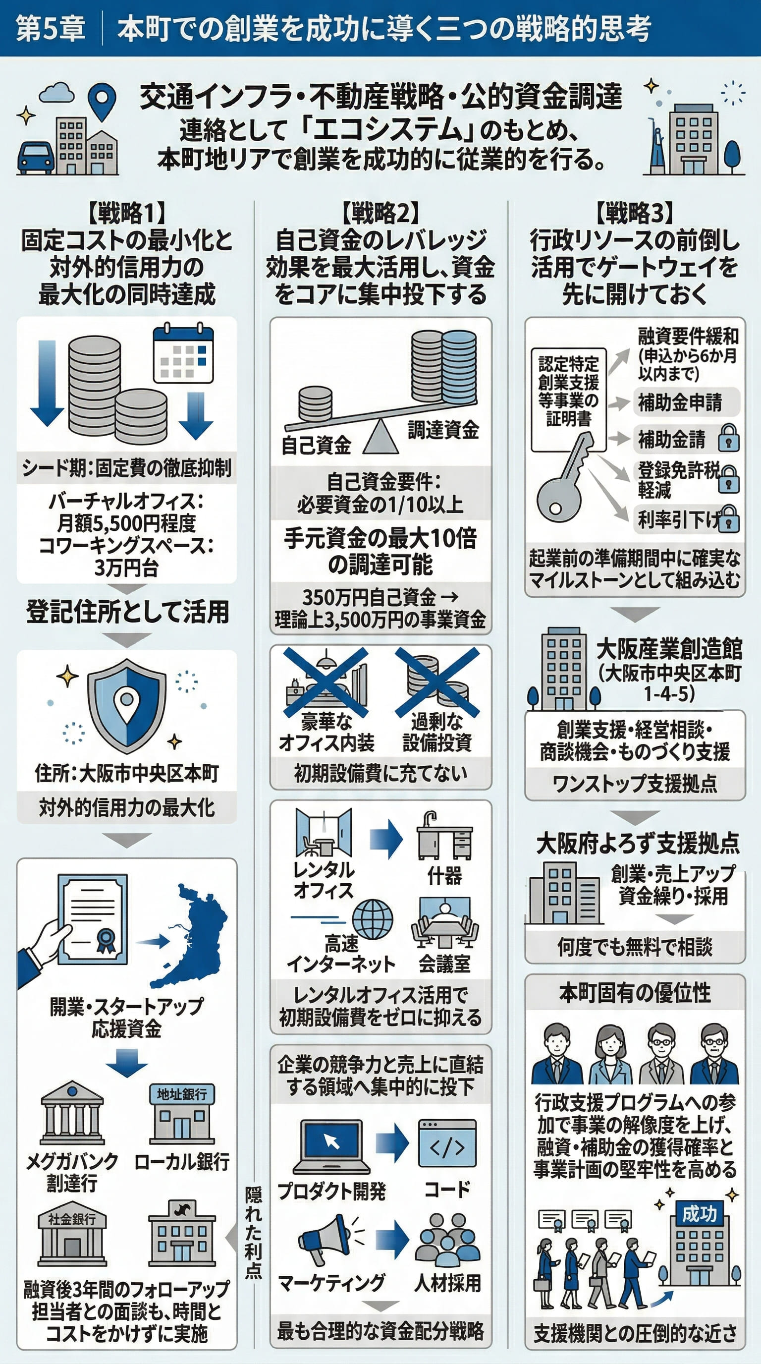 「大阪市中央区本町」という住所を持つことで、大阪府・大阪市の「開業・スタートアップ応援資金」への申し込みを堂々と行えます。また、本町エリアにはメガバンク・地方銀行・信用金庫の支店や商工会議所の拠点が高密度に集積しているため、融資後3年間のフォローアップ担当者との面談も、時間とコストをほとんどかけずに実施できます。