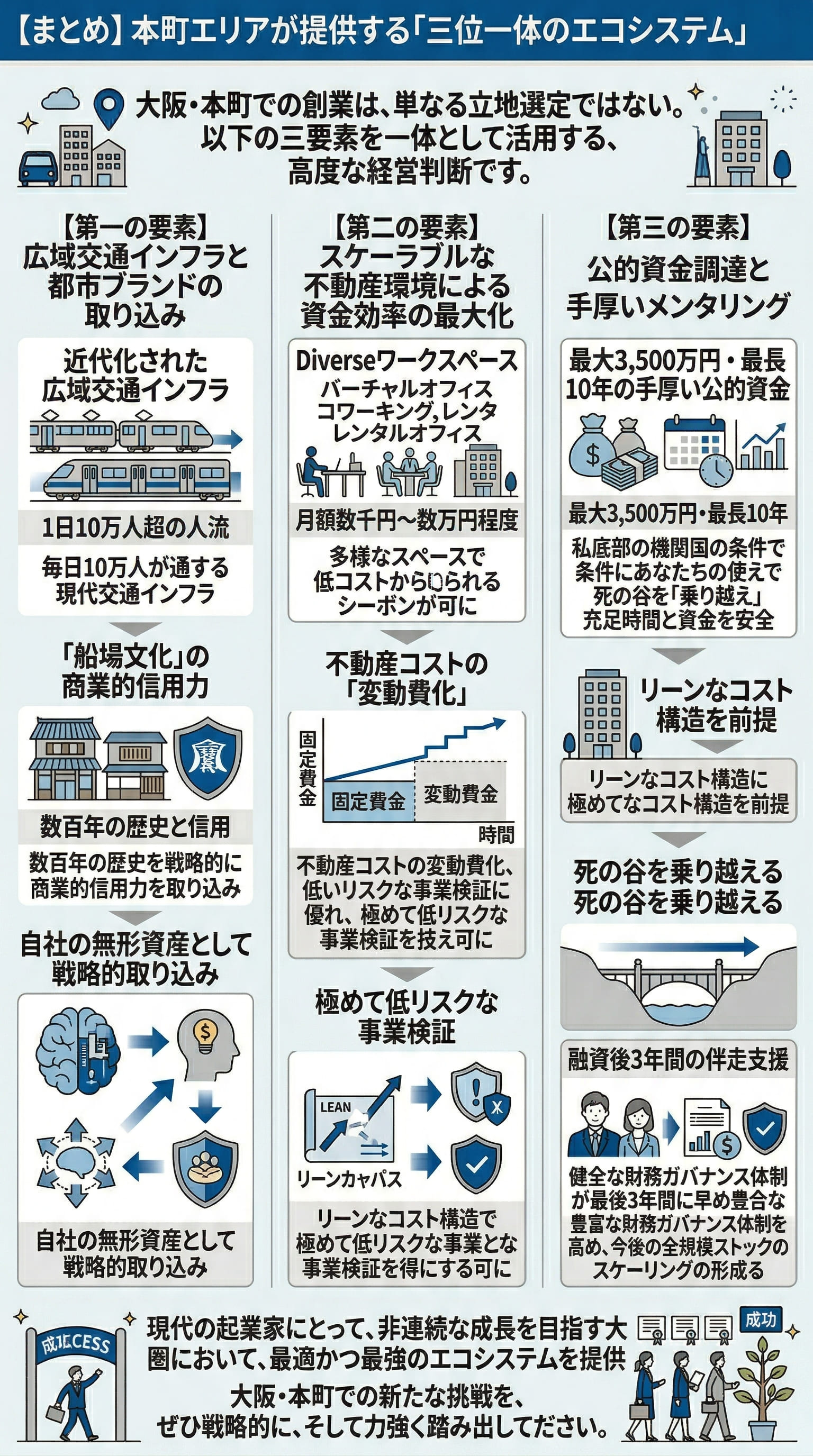 これら三要素が高度に結びついた本町エリアは、事業リスクを精緻にコントロールしながら非連続な成長を目指す現代の起業家にとって、大阪圏において最適かつ最強のエコシステムを提供していると言えるでしょう。
