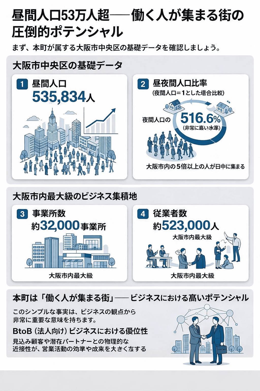 本町は「住む街」ではなく「働く人が集まる街」——このシンプルな事実が、ビジネスの観点からは非常に重要な意味を持ちます。